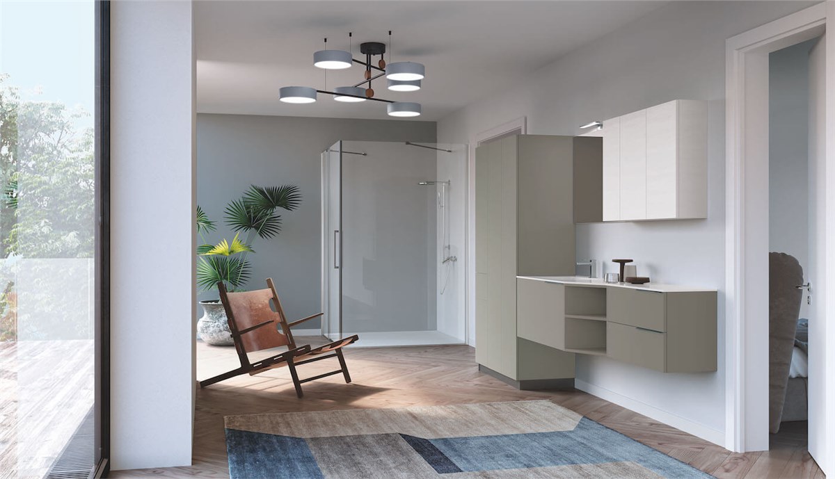 Per ambienti più ampi e chic, invece, risulta molto invitante la soluzione P01, nei toni più neutri dell'argilla e a sviluppo prevalentemente orizzontale per quel che riguarda la forma di mobili, cassettiere, specchio e ante.