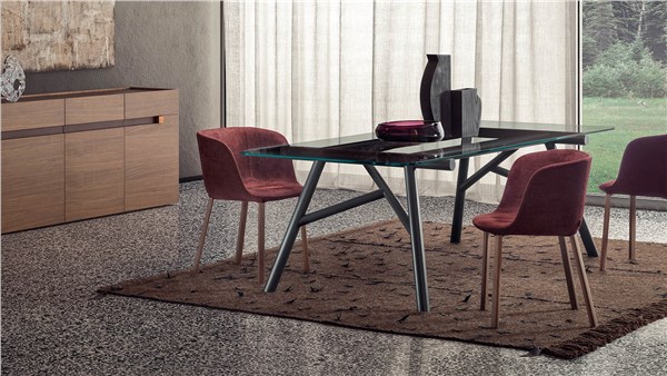 Il tratto distintivo del tavolo è dato da elementi che richiamano le travature reticolari tipiche delle capriate architettoniche. La struttura è realizzata in essenza abbinata a metallo verniciato, mentre il piano può essere scelto in cemento naturale o cristallo fumé.