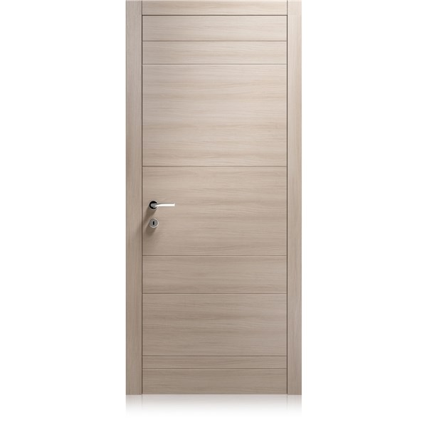 Il modello TRATTO è disponibile cieco con telaio Flat a scomparsa o Pivot, oppure con telaio Genius Eleva. Si presenta come porta interna cieca, con apertura a battente o scorrevole, e l’anta mantiene la finitura sintetica orizzontale abbinata agli inserti in legno per un contrasto delicato e sofisticato.