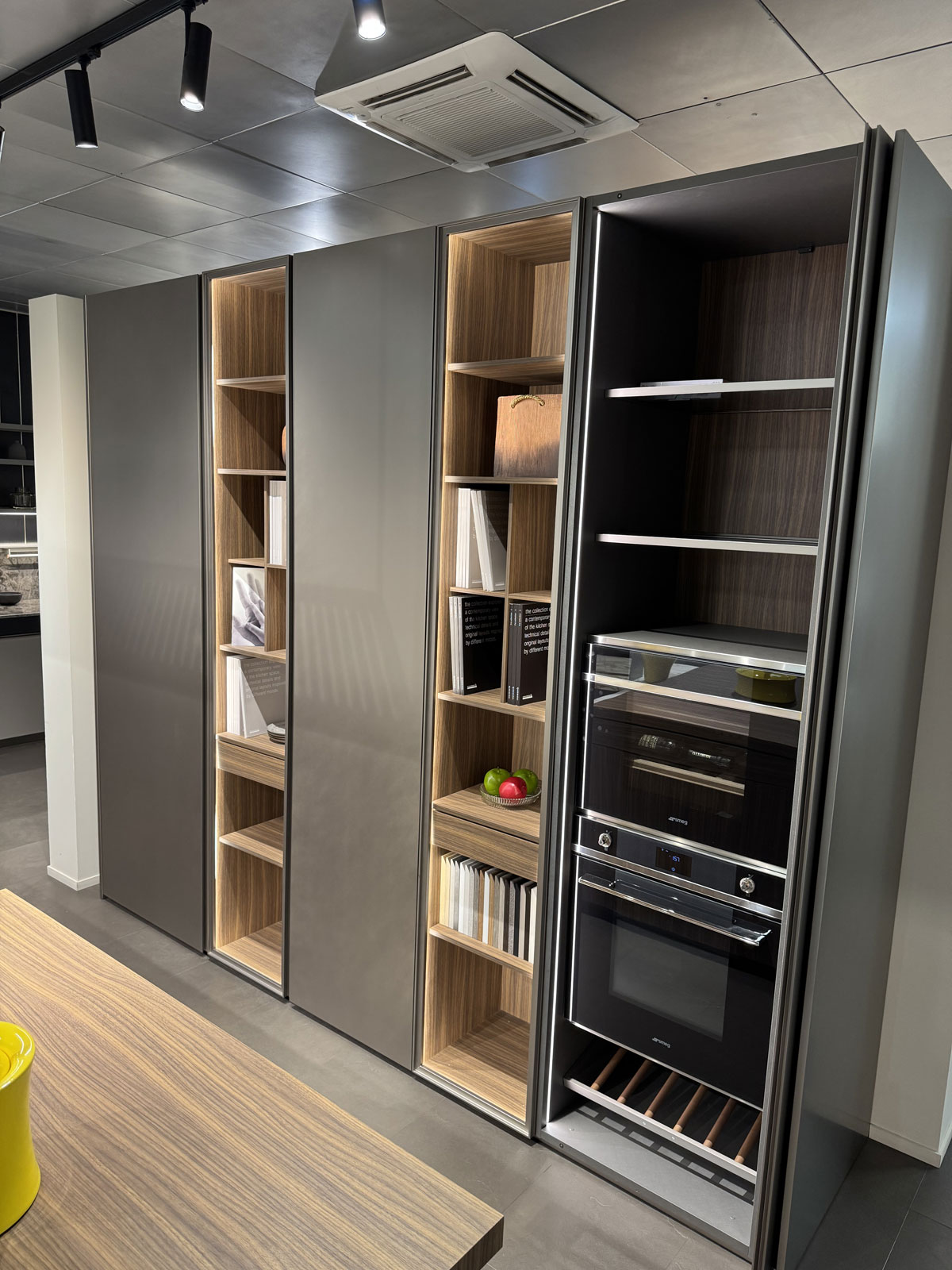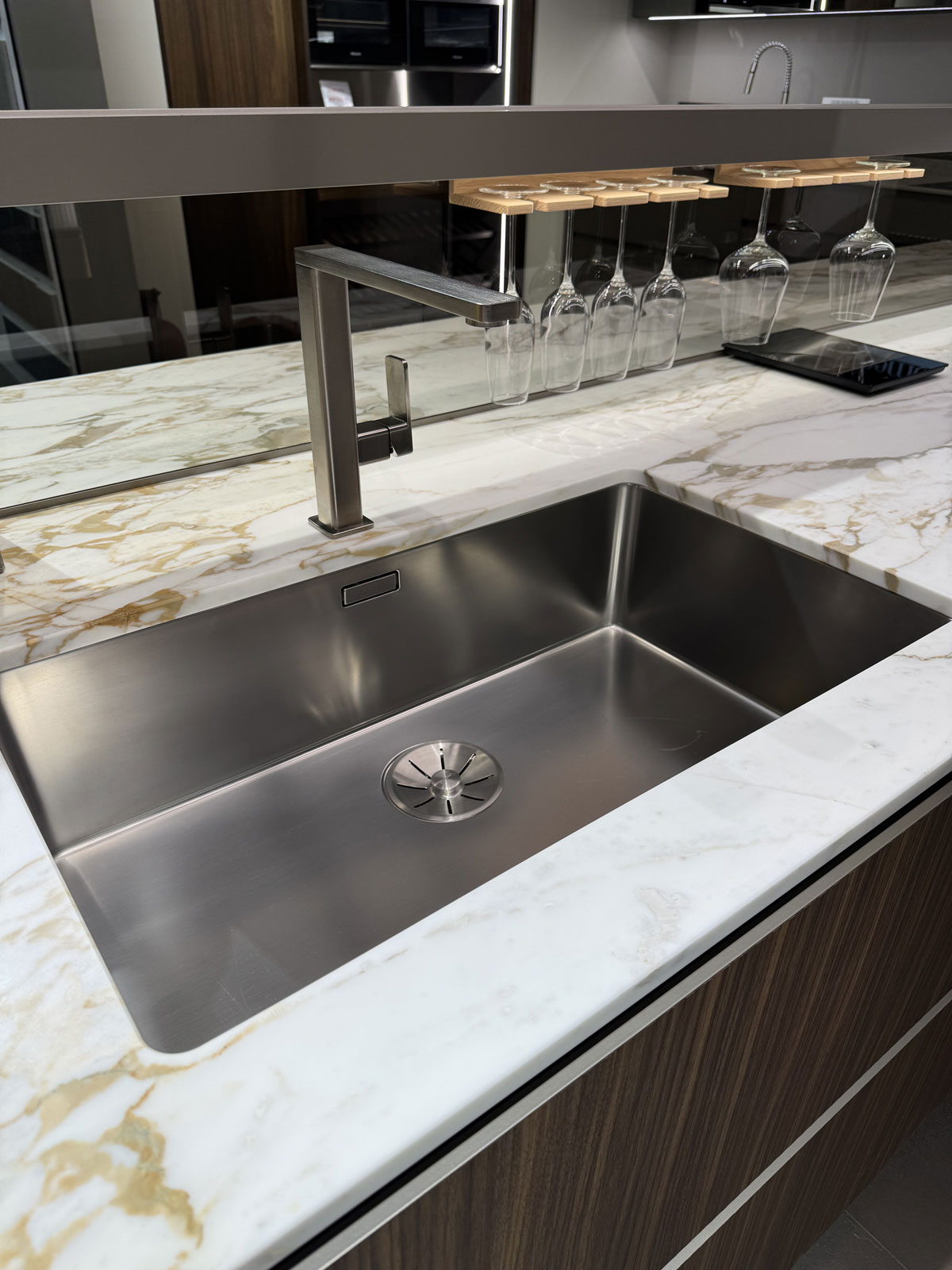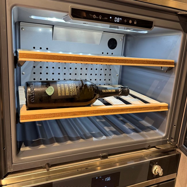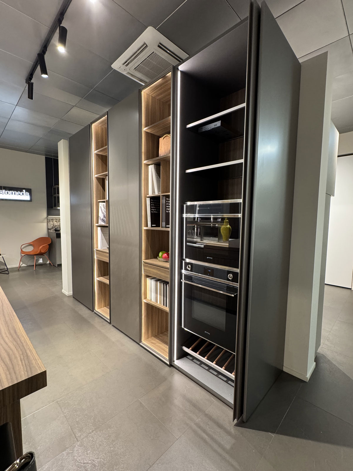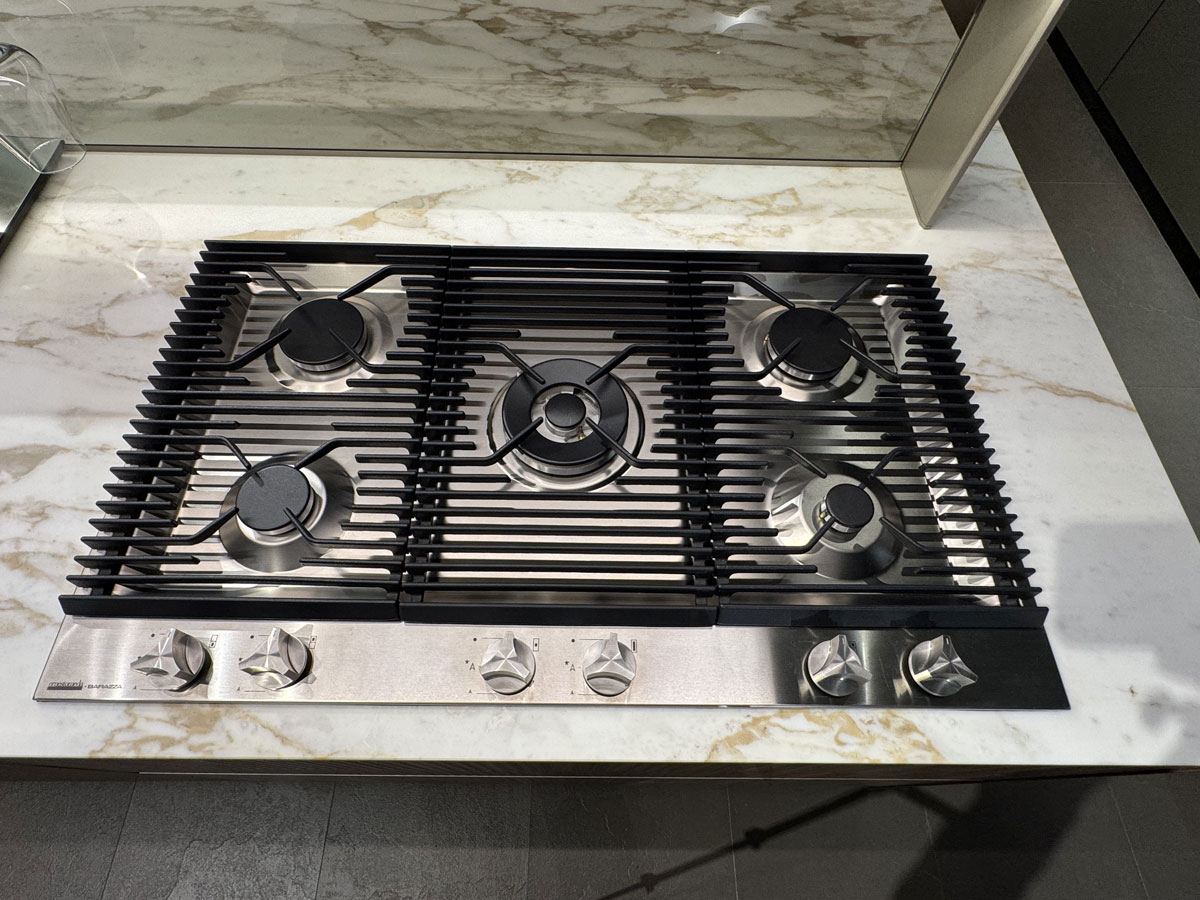 Elettrodomestici: piano cottura gourmet prof 90 Gourmet by Giuseppe Bavuso - lavastoviglie, forno, frigo, cantina Smeg - Lavello sotto top inox - cappa K-System acciaio con griglia in legno