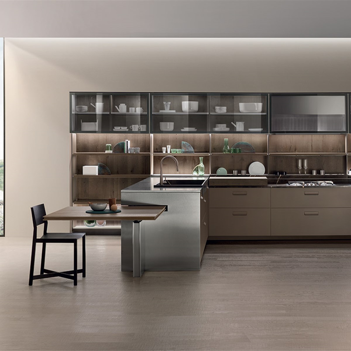 Nella cucina Soul l'ampia gamma di soluzioni tecniche ed elementi componibili corrisponde ad un ventaglio parimenti assortito di colorazioni, materiali e finiture disponibili. Le scelte materiche cadono su abbinamenti sofisticati e originali e prediligono materiali robusti, come legno, acciaio e vetro, rifiniti da finish lussuosi. I top si lasciano scegliere, ad esempio, in pietra Piasentina o in marmo Calacatta, mentre pensili e ante sono disponibili in Rovere, nelle versioni Terra d'Ombra e Termotrattato, e nel caldo color caramello dell'alternativa in Olmo.