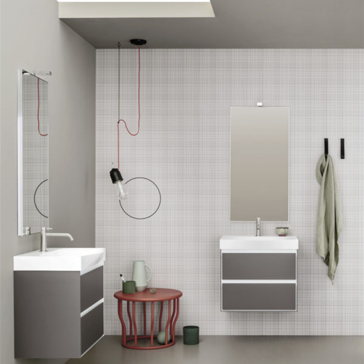 Face propone soluzioni semplici ma allo stesso tempo di grande impatto visivo, come la base sospesa bianca con cassetto e vano a giorno e top fango che completata con un lavabo d’appoggio rettangolare dagli arrotondati in ceramica bianca rappresenta una valida idea per un bagno moderno e dinamico. Una composizione che abbinata a colonne pensili con ripiani a giorno e uno specchio rotondo, sono perfetti per dare classe e armonia all’ambiente.