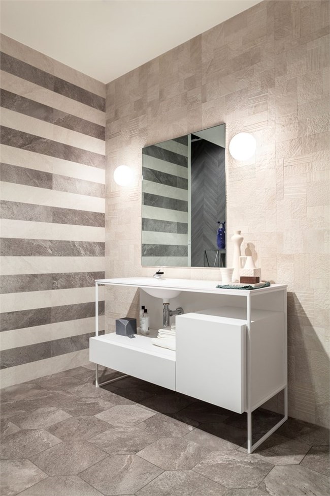 La “materia pietra” è caratterizzata da una profonda tridimensionalità e da una varietà grafica pressoché infinita, frutto della tecnologia digitale più avanzata propria di Ceramica Sant’Agostino. La selezione accurata di punti colore appartenenti alla famiglia dei warm grey dona questa collezione una personalità estetica forte e, allo stesso tempo, delicata.